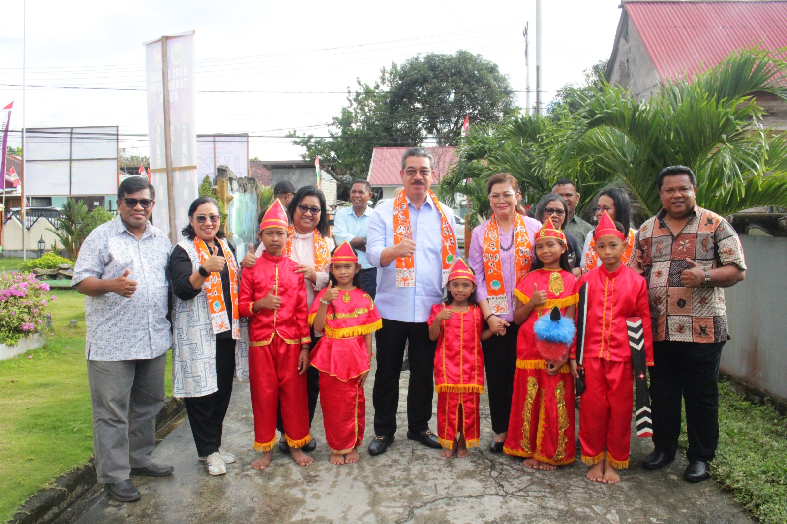 Tarian adat yang dibawakan putra-putri setempat menyambut kedatangan Gubernur dan istri. Dengan senyum penuh ketulusan, Gubernur menyapa anak-anak, memeluk mereka, bahkan meluangkan waktu untuk berfoto bersama.